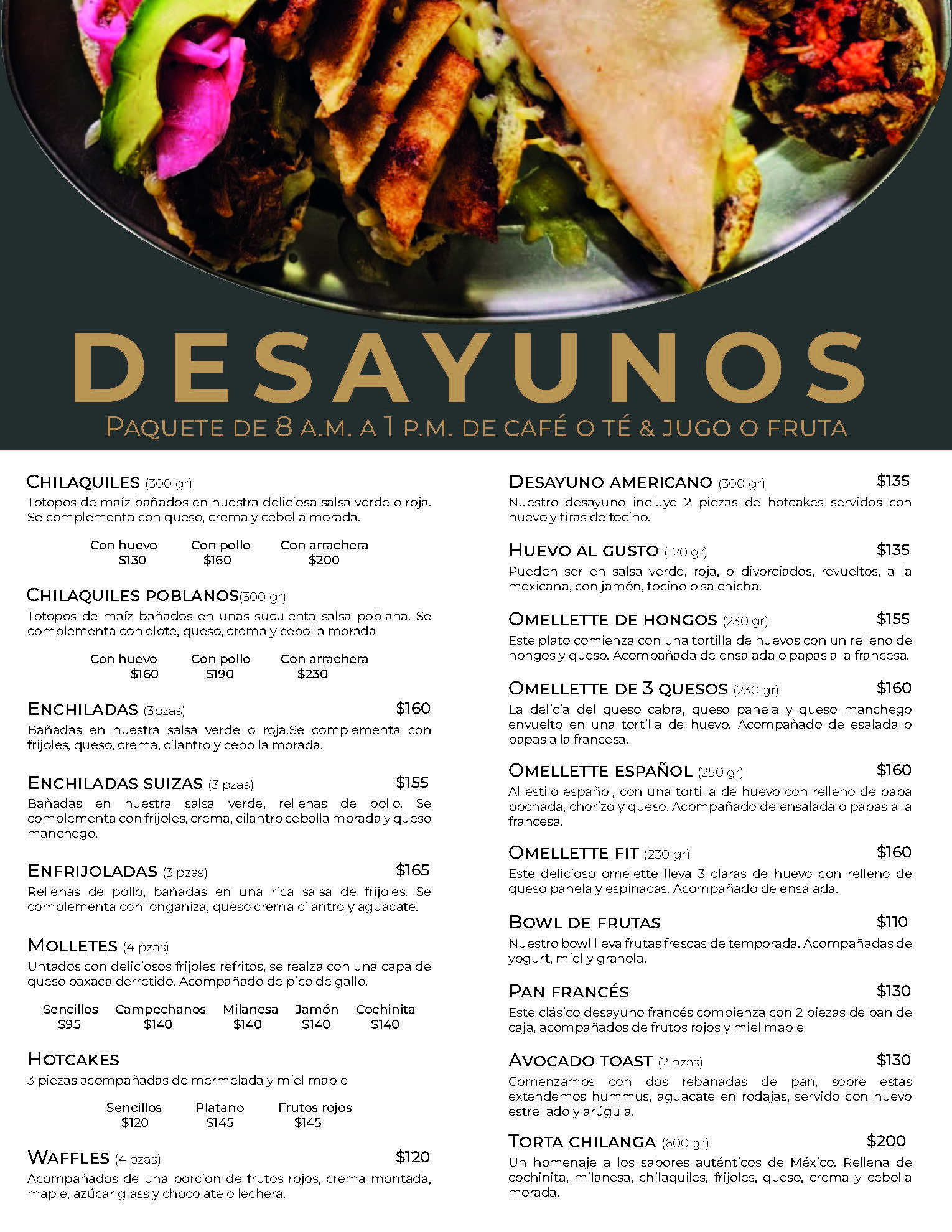 Somos tu destino gastronómico para disfrutar de platillos auténticos y creativos. Desde energéticos desayunos mexicanos e internacionales hasta robustos platos fuertes de arrachera y pechuga asada , y nuestra variada selección de Crêpes dulces y saladas. ¡Sabor, tradición y frescura en cada bocado!